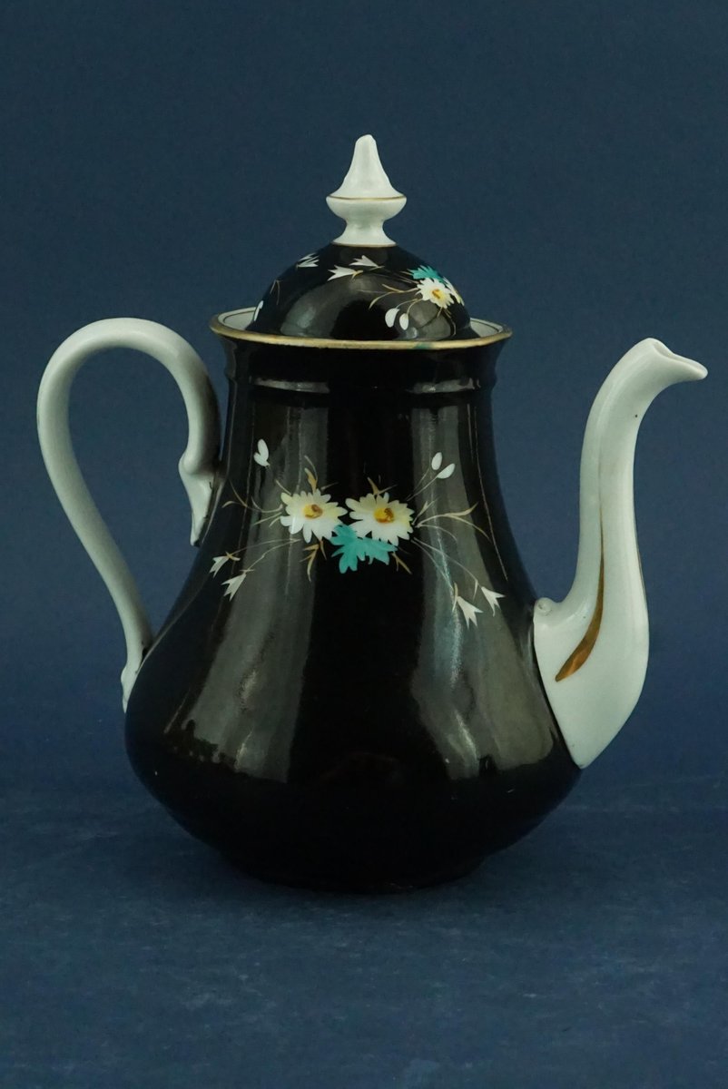 The object is very old, the porcelain is thick, heavy and very hard, milky white, rich in kaolin as for all the oldest porcelains, the line of the object is in empire style, as are the decorations, and the brand under the coffee pot is the one used by the Ginori factory from 1782 to 1850, for all these reasons we are certainly talking about an object datable between 1800 and 1820. To confirm this dating we invite you to look at the handle at the two attachment points, which is absolutely from the end of 1700 or at most the first decades of 1800, identical to that present in the coffee pot of the VIVOLO collection dated 1780, attached in the last photos. Even the gold decorations on the handle and on the spout are slightly erased by the passage of time and the patina of the porcelain under the base, where there is no enamel, is clearly from a very old object. Very beautiful floral decoration, a pair of daisies on a black background, which, by the way, is a very, very rare background to find.