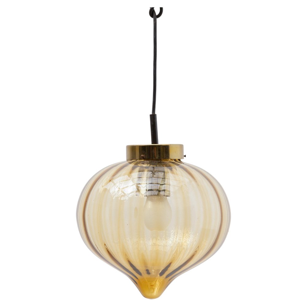 Glass & Brass 3-Light Cylinder Pendant Lamp with White Stripe Shades by Tapio Wirkkala, 1950s