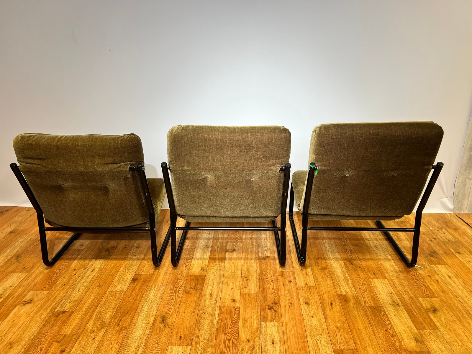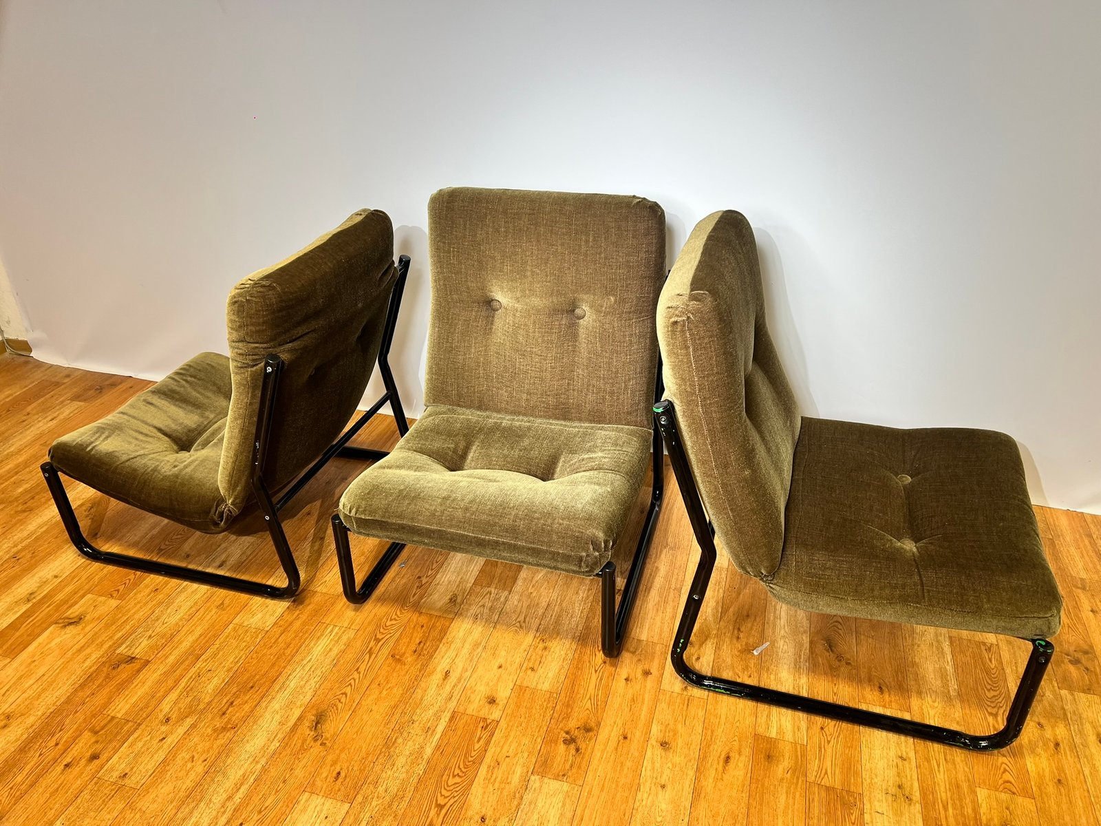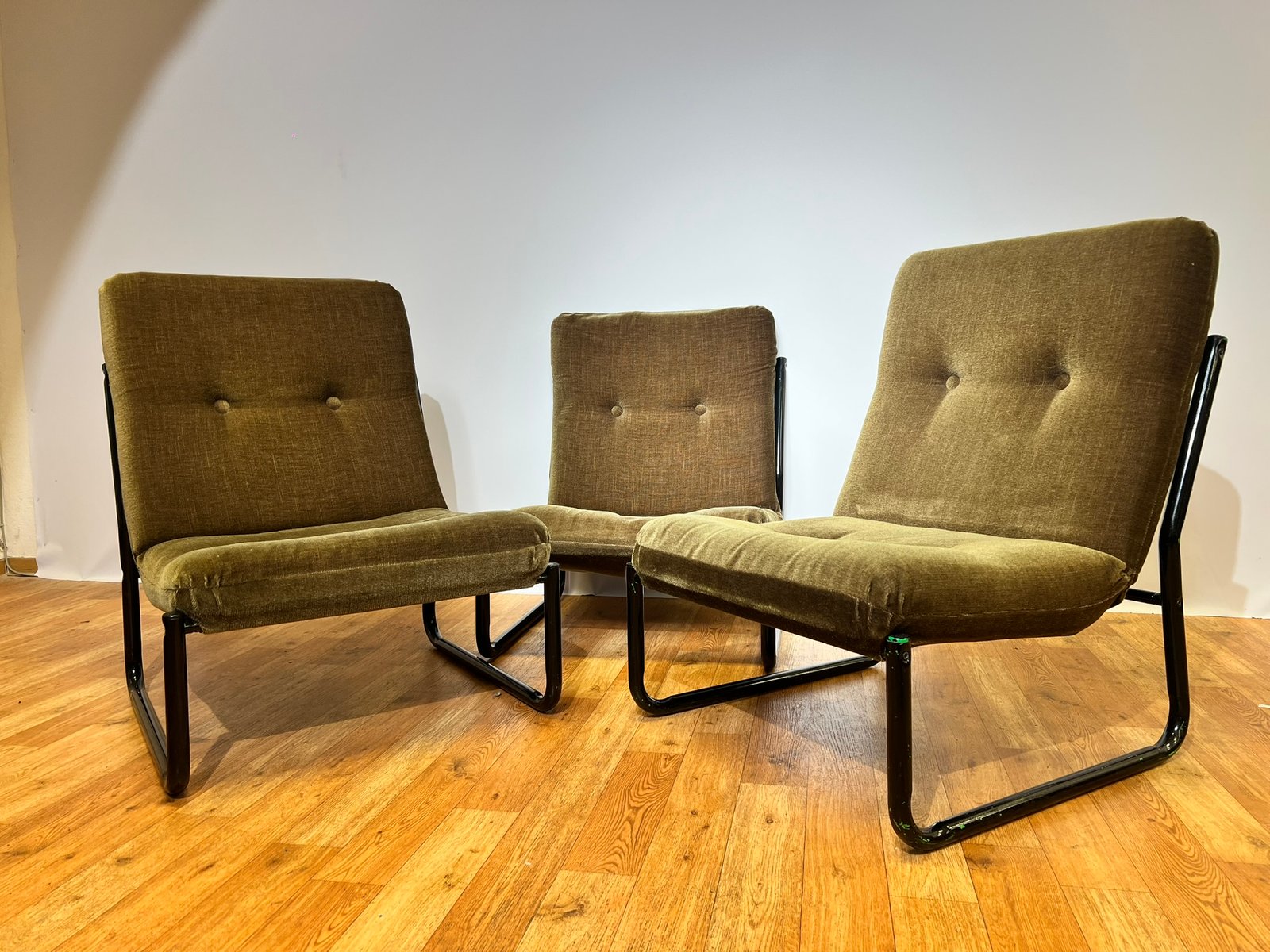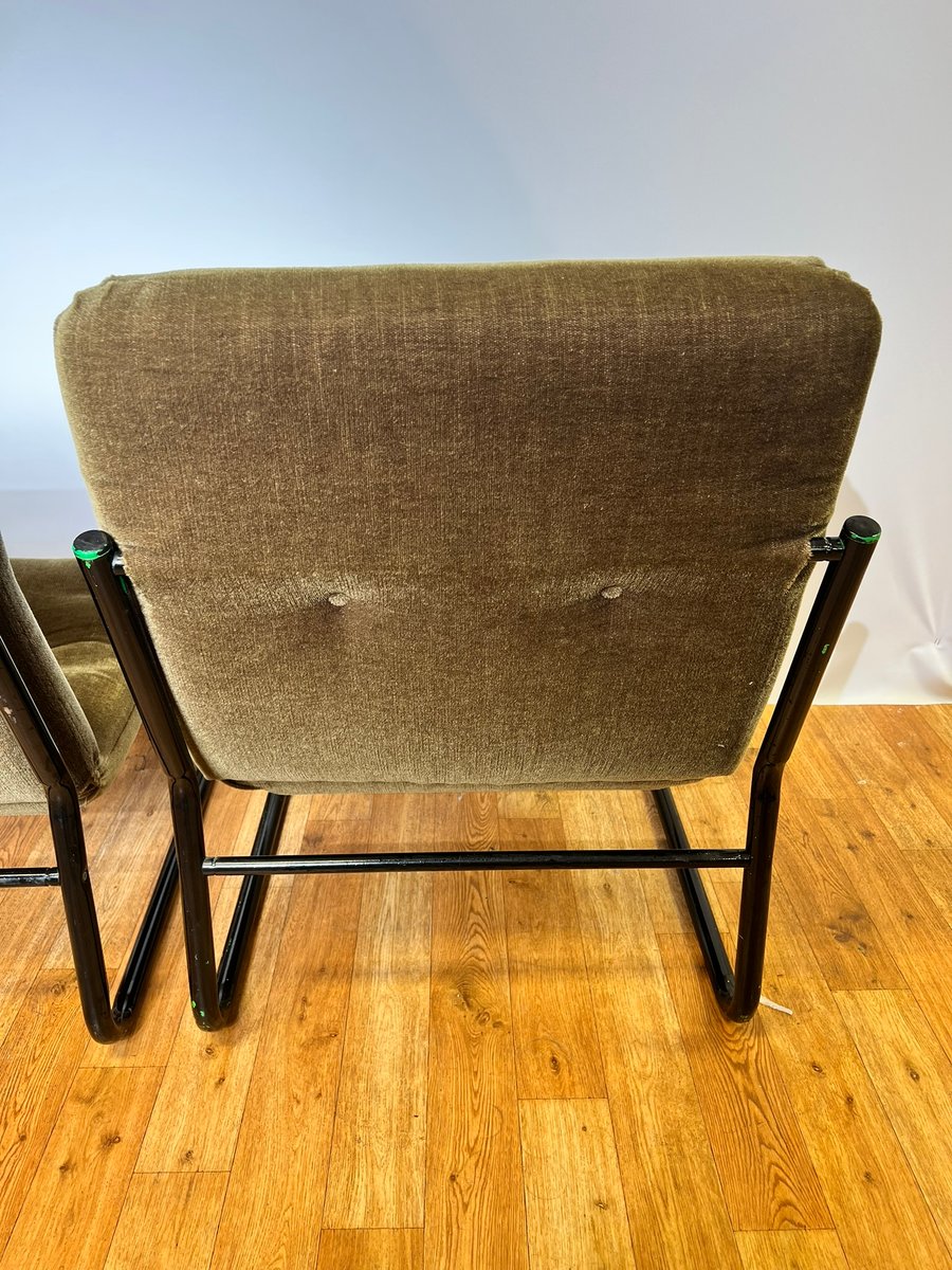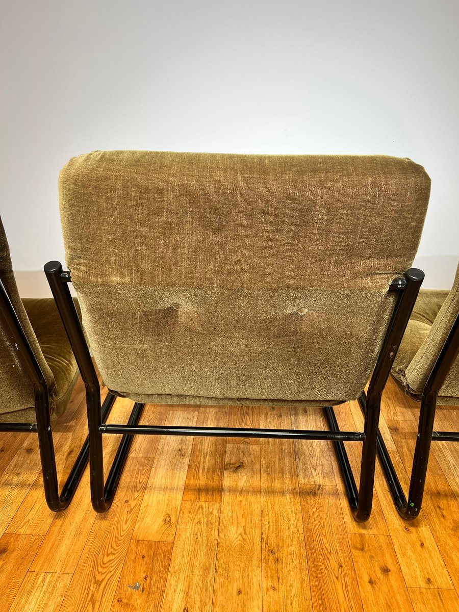 Bauhaus Black Steel and Green Upholstery Lounge Chairs, 1970s, Set of 3