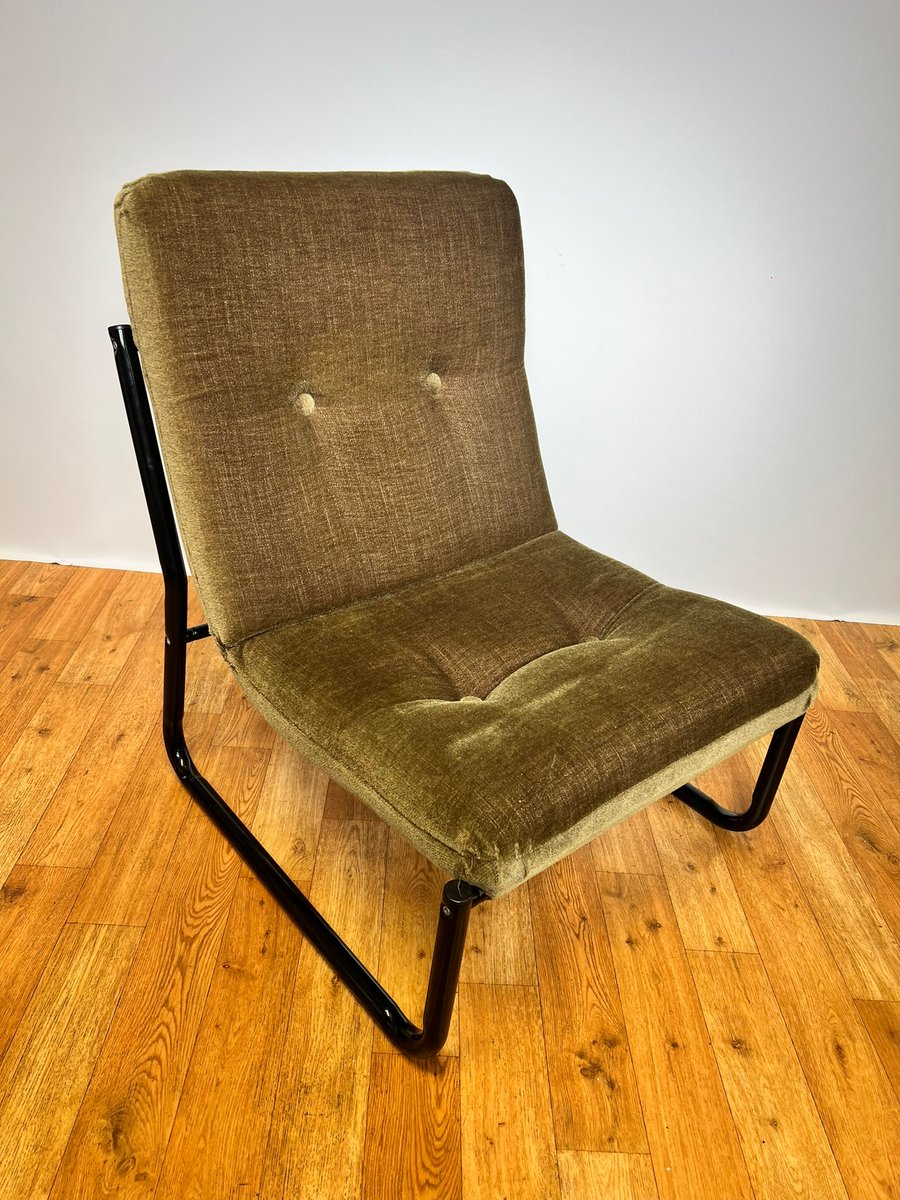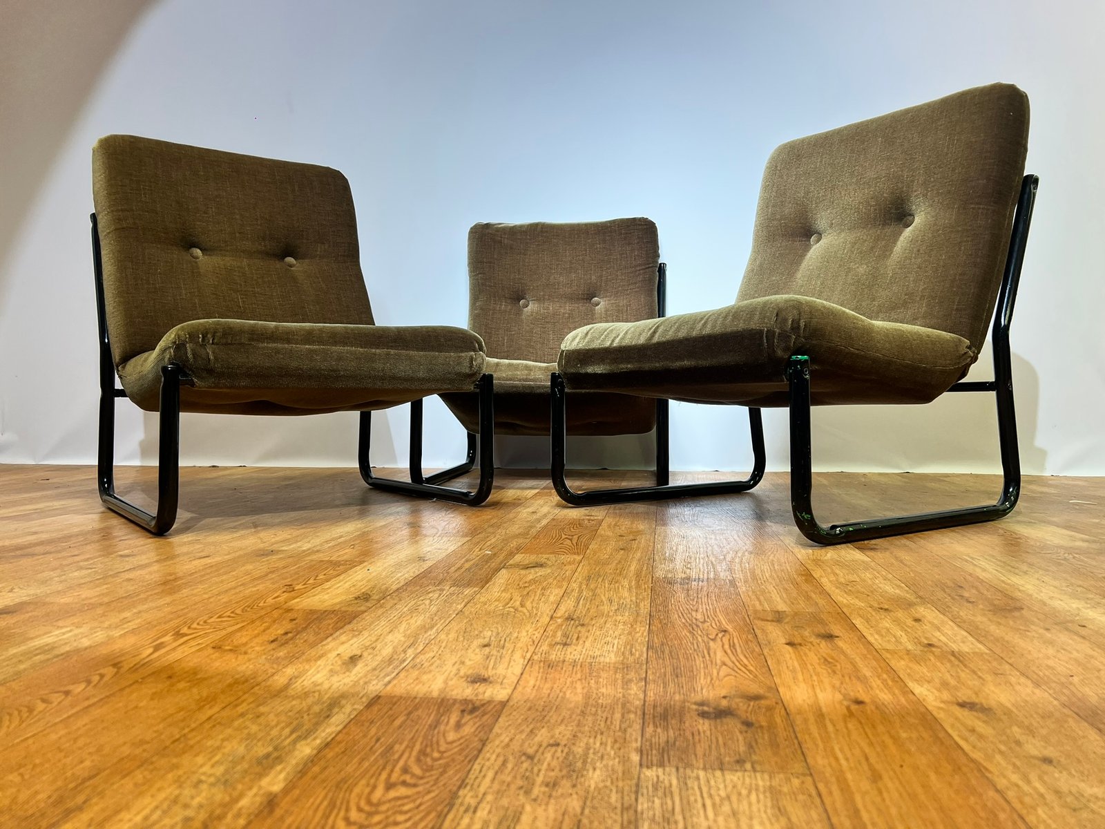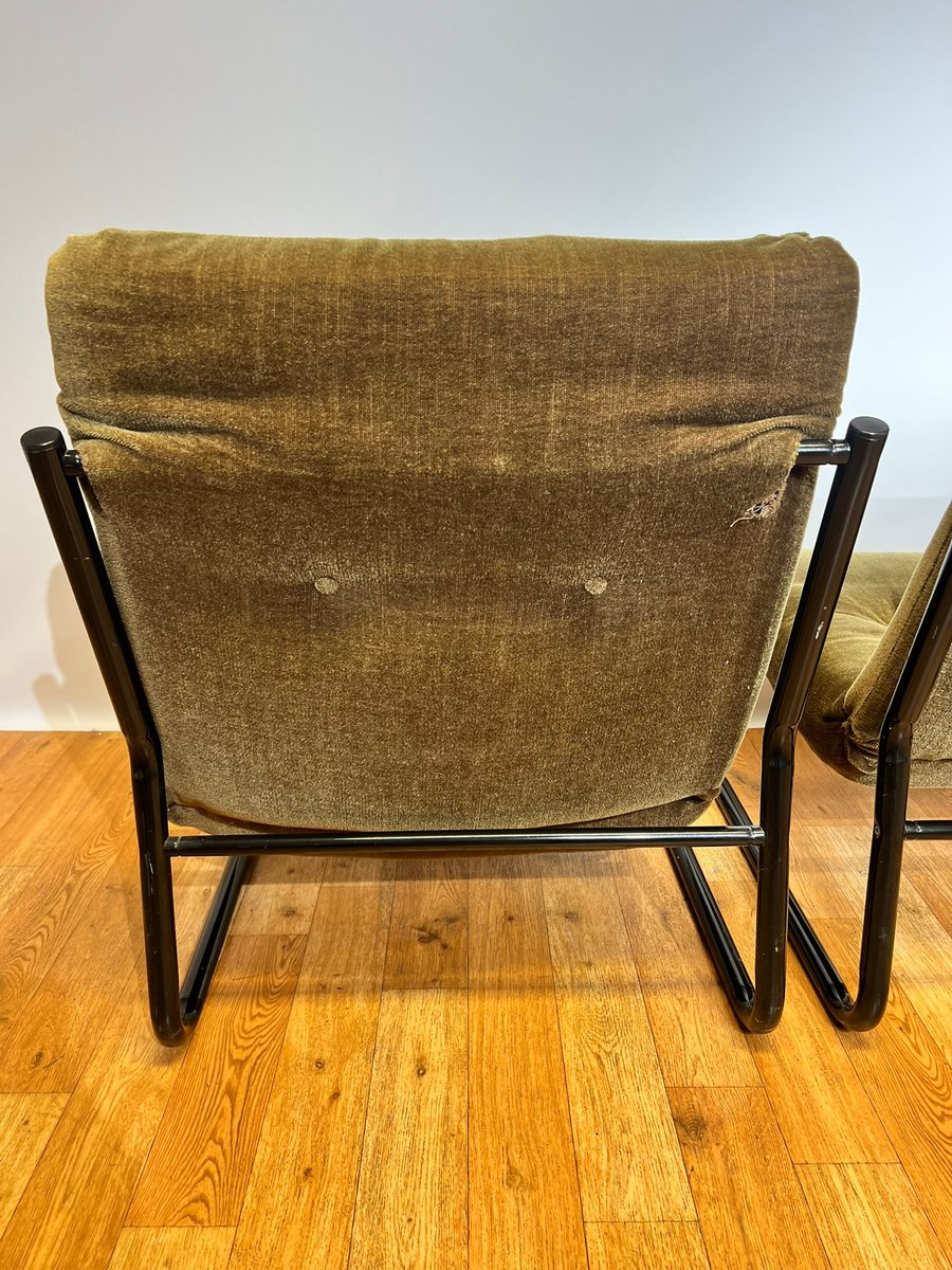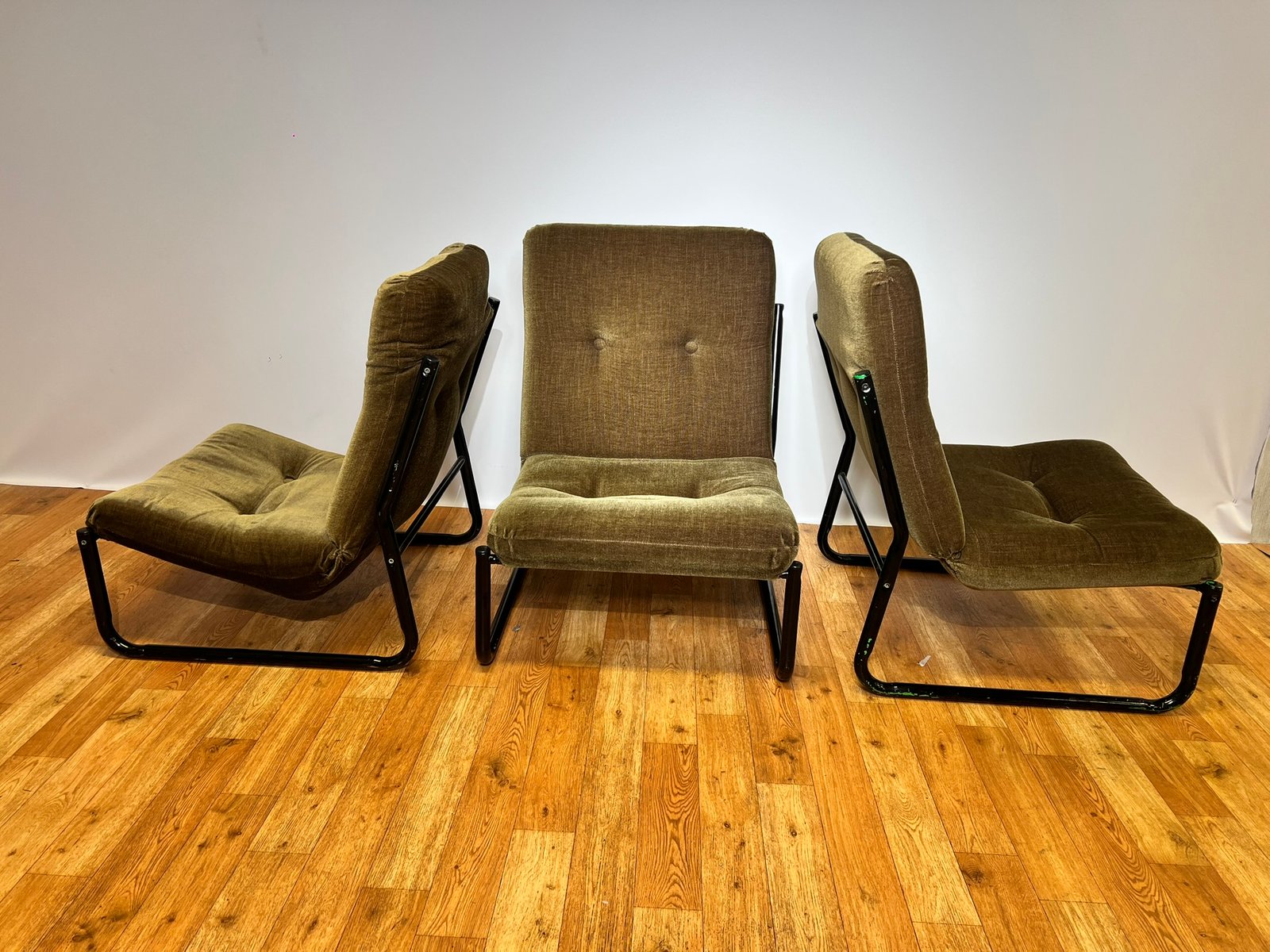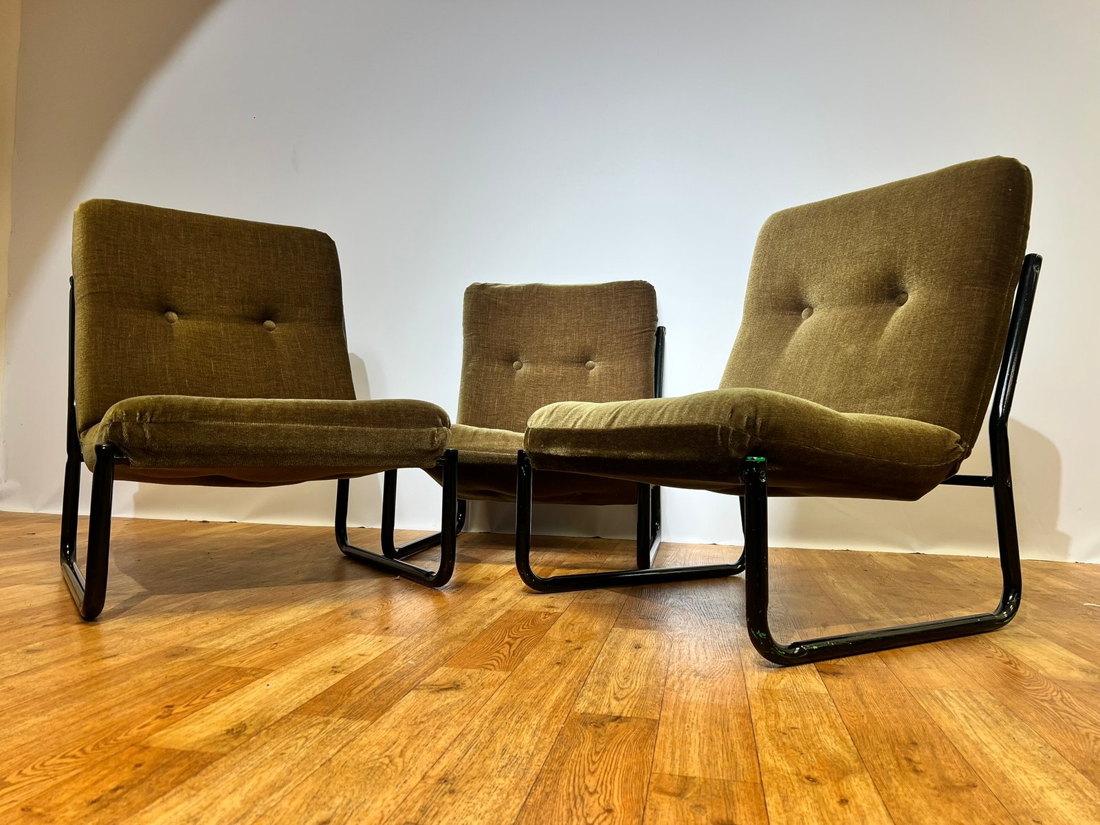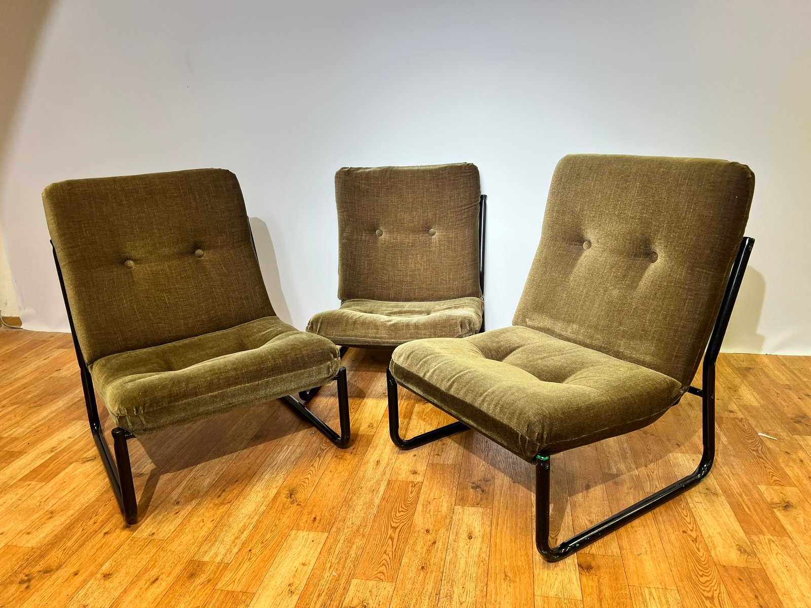 Bauhaus Black Steel and Green Upholstery Lounge Chairs, 1970s, Set of 3