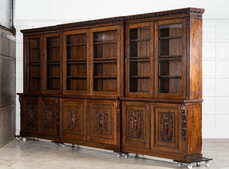 English Carved Oak Breakfront Glazed Bookcase, 1870s