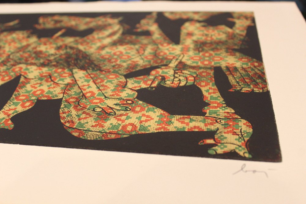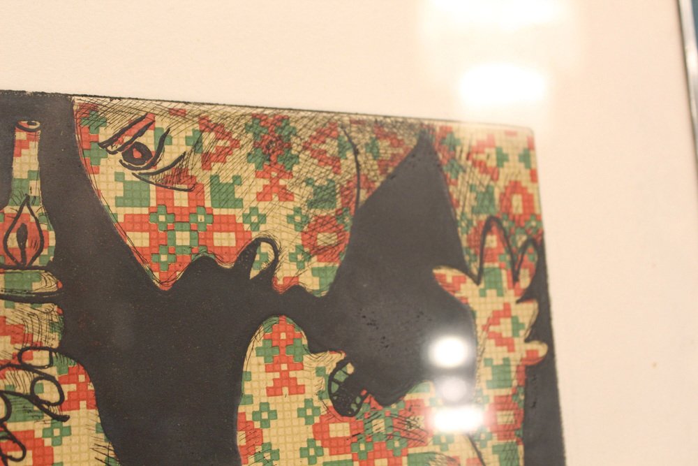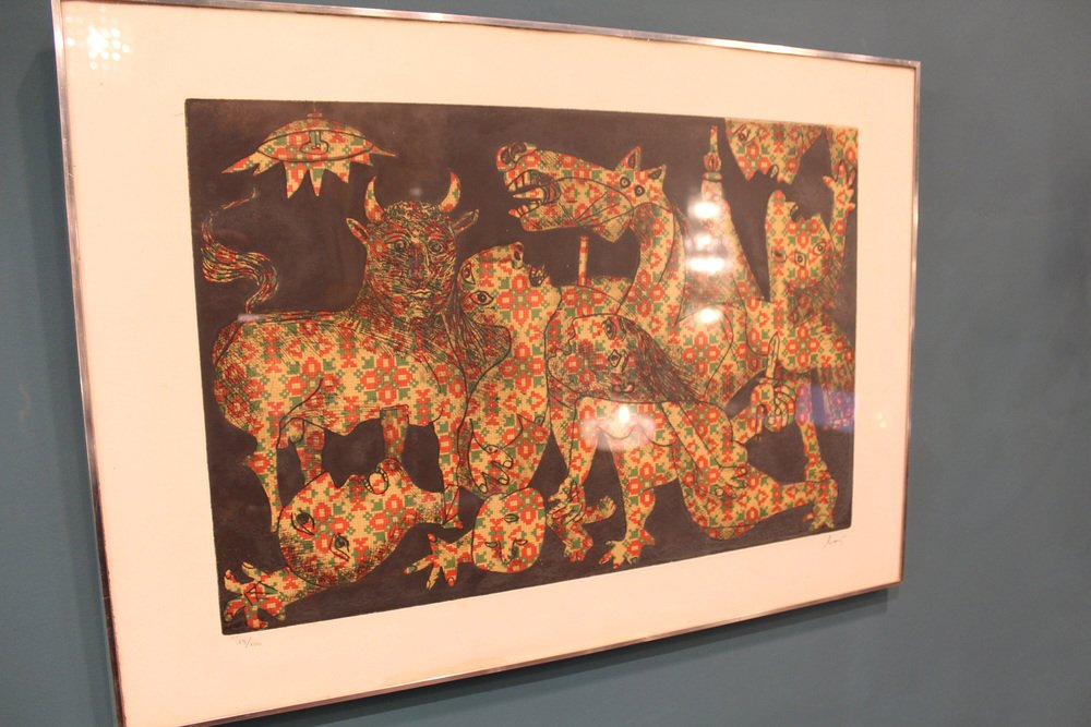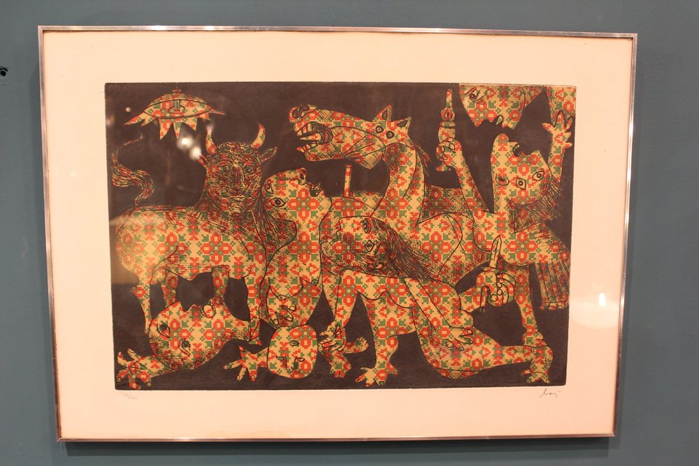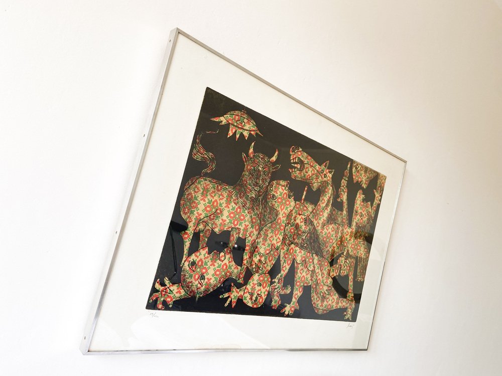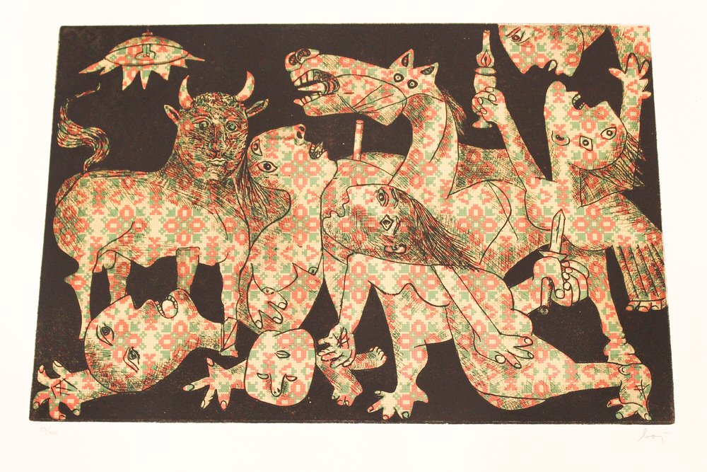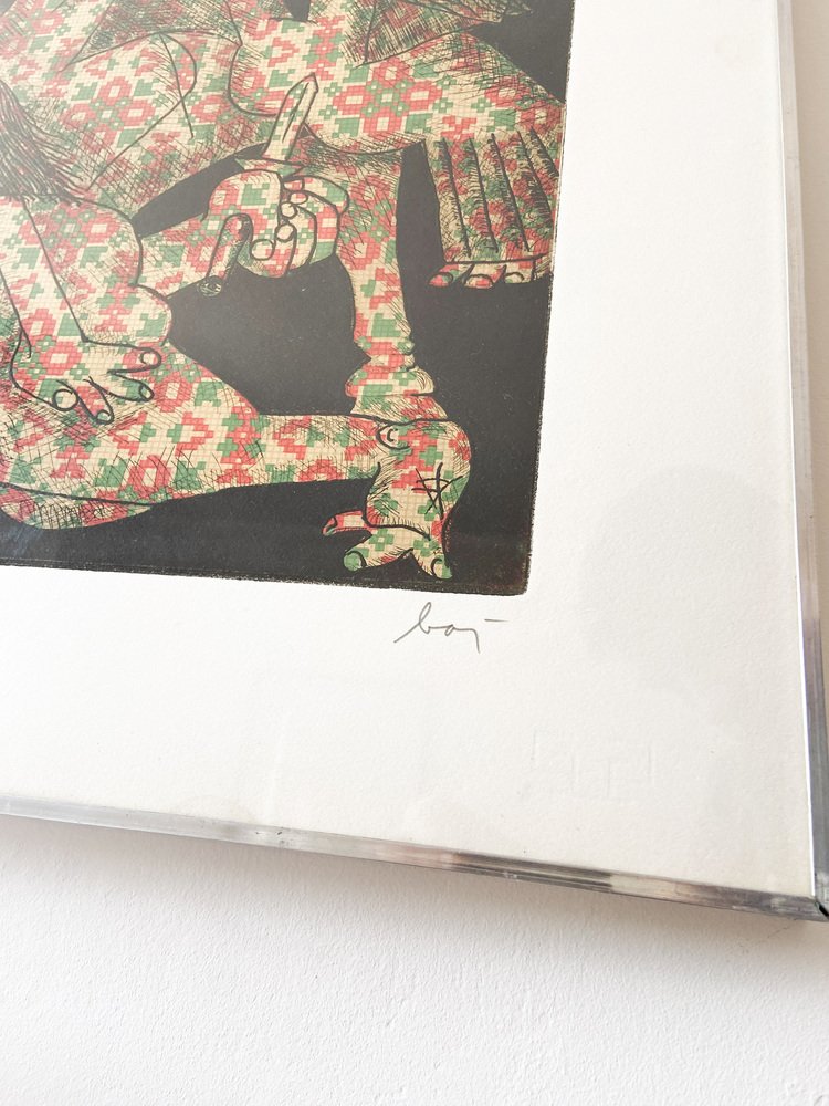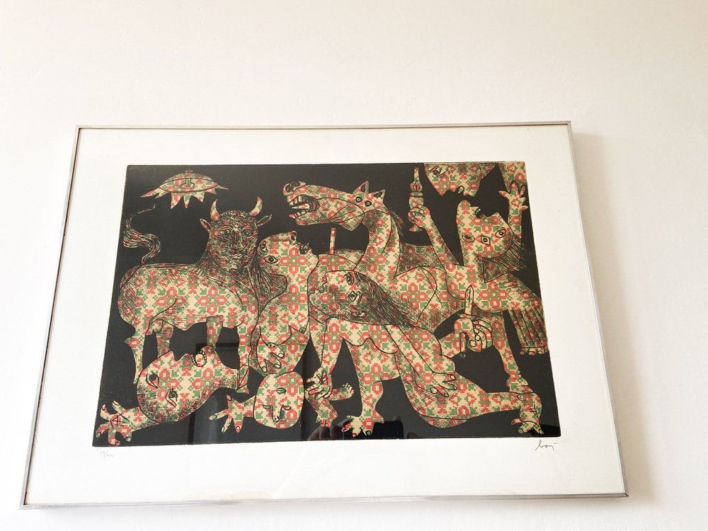 Aquatint,etching, Guernica,Enrico Baj, Italy 1960, Baj Chez Picasso 2 Etching and aquatint by Enrico Baj Signed and numbered in pencil by the artist. The work is in very good condition. Enrico Baj, one of the most important Italian artists of the 1950s and 1960s, was born in Milan in 1924. After graduating from the Liceo Classico, he began studying medicine at the University of Milan, which he abandoned after World War II in favor of the Faculty of Law (which he completed by becoming a lawyer) and the Brera Academy of Fine Arts, often in parallel.In 1951 he held his first solo exhibition at the Galleria San Fedele in Milan, where he presented informal works. In 1952, together with Sergio Dangelo, he signed the manifesto of nuclear painting, and in 1954, together with Asger Jorn, he founded the International Movement for an Imaginative Bauhaus, which opposed the excessive rationalization and geometrization of art. In 1957 he signed the manifesto Against Style, which sought to affirm the unrepeatability of the work of art. For Enrico Baj, these are years of great reflection and intellectual exchange thanks to his contacts with international artists such as Lucio Fontana, Piero Manzoni, Joe Colombo, Lucio Del Pezzo, Giò Pomodoro, Max Ernst, Marcel Duchamp and Yves Klein.In his artistic research, which is expressed in polymateric and polychromatic collages, two tendencies can be distinguished: a more playful and ironic one, in which the pleasure of painting with all kinds of materials prevails, and a more sarcastic one, marked by a strong commitment that is expressed in the generals and military parades of the 1960s, and even more so in the works of the 1970s, such as The Funeral of the Anarchist Pinelli (1972) and The Apocalypse (1979). from then on, his critique of contemporaneity became increasingly strong. In the series Metamorphosis and Metaphors (1988), Baj develops an imaginary world dominated by kitsch, the only style that, according to the artist, succeeds in representing today's culture. The 1990s saw cycles of tribal masks, felts and totems expressing modern primitivism by recycling everyday objects.Numerous were the artist's relationships with Italian and foreign poets and writers, which led to various collaborations and the creation of several artist's books, accompanied by original prints or multiples.Baj died in Vergiate (Varese) on June 16, 2003.1970sHeight: 50 cmWidth: 71 cmDepth: 2 centimeters