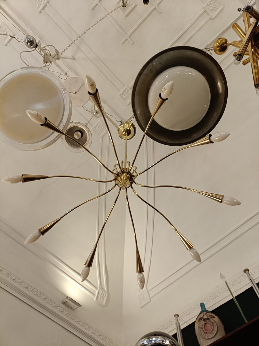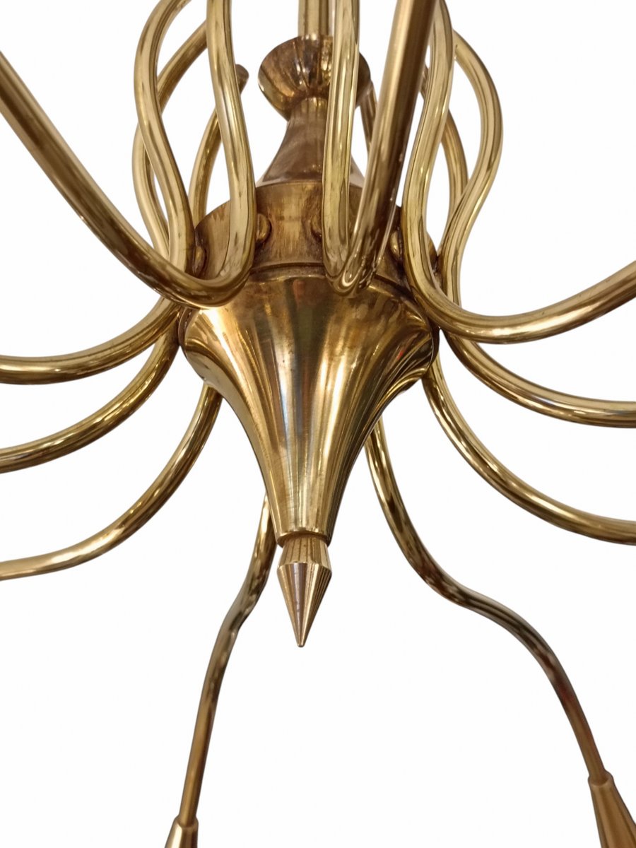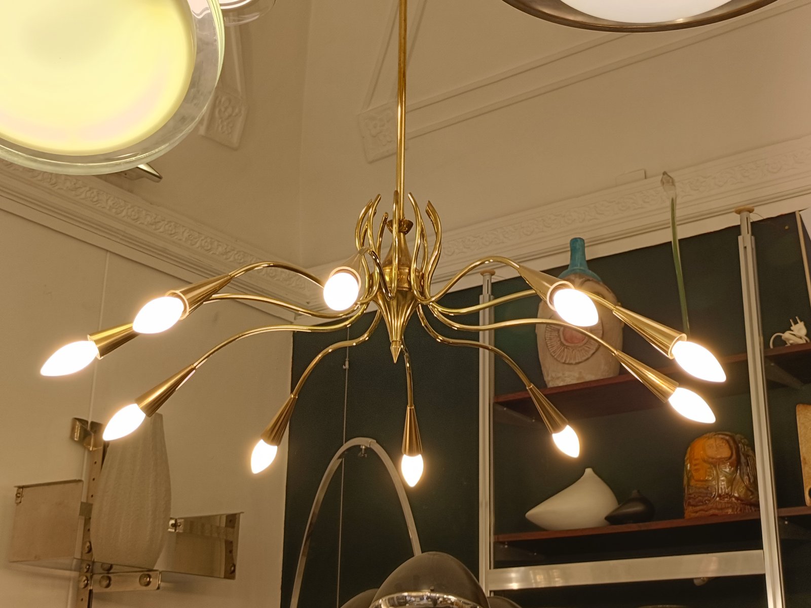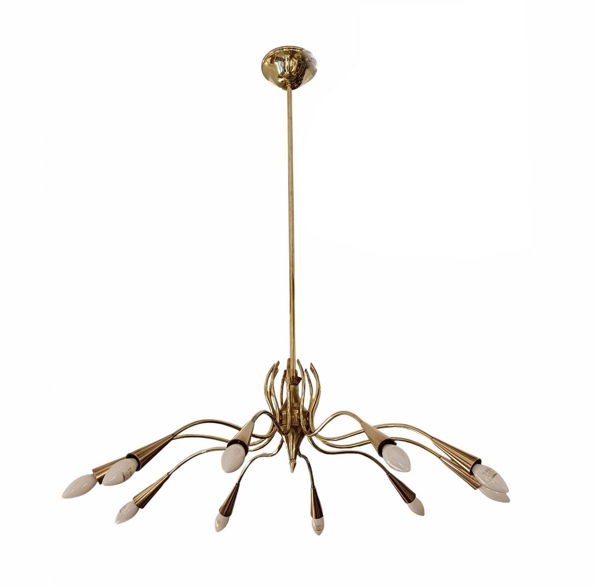 Large Brass Spider 10-Light Chandelier attributed to Oscar Torlasco for Lumi, Italy, 1950s