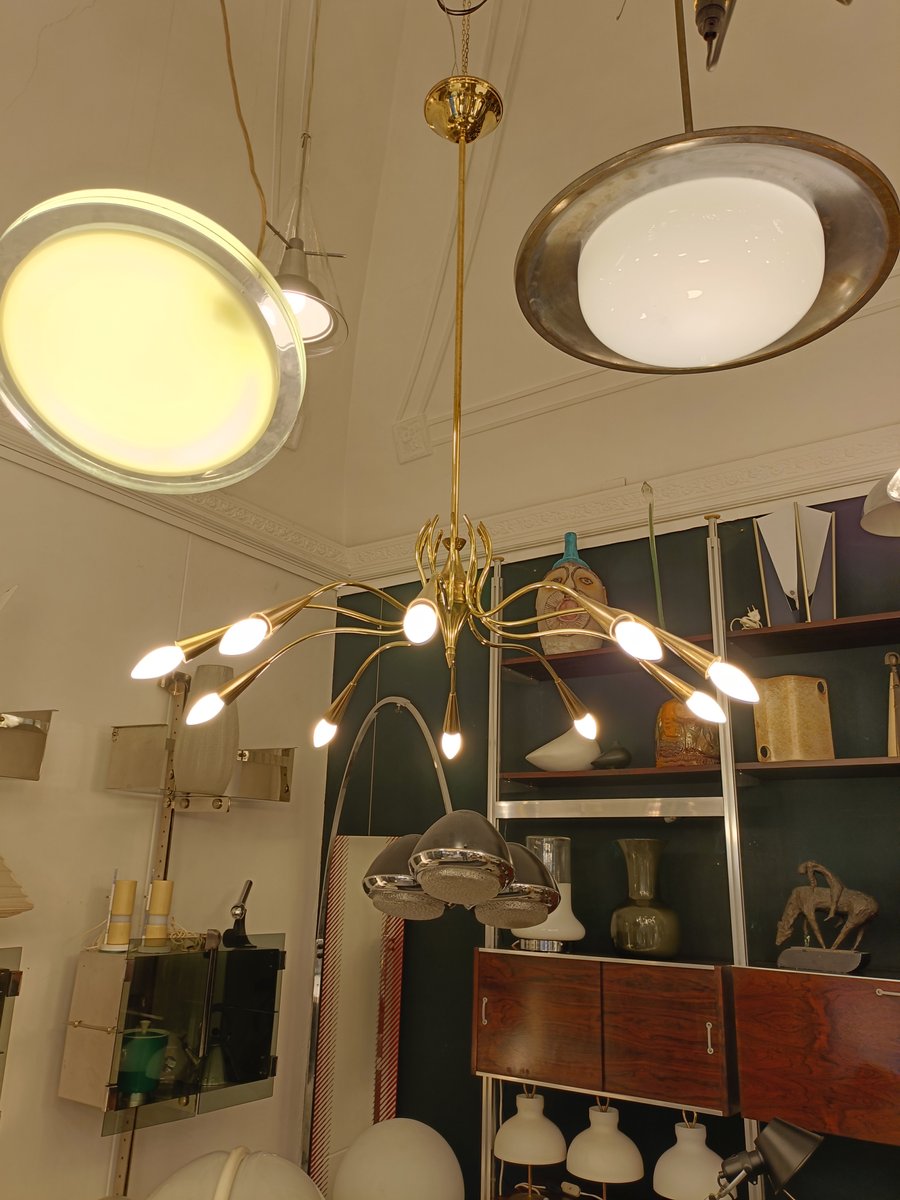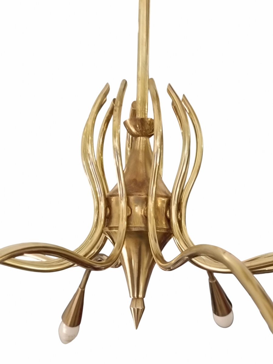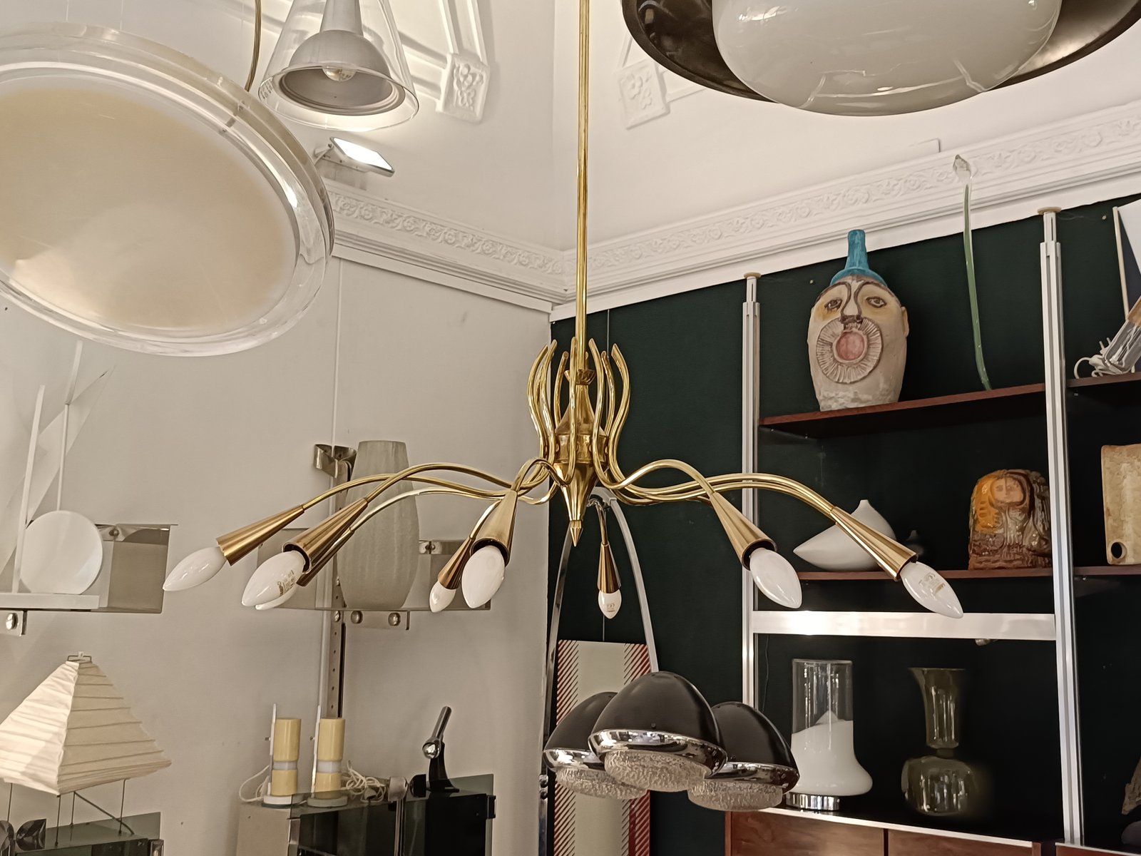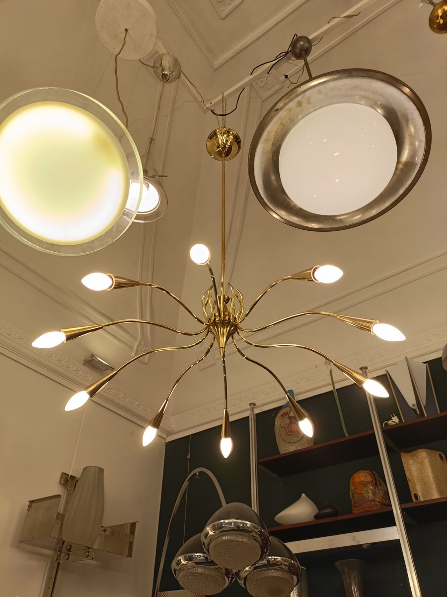 Large Brass Spider 10-Light Chandelier attributed to Oscar Torlasco for Lumi, Italy, 1950s