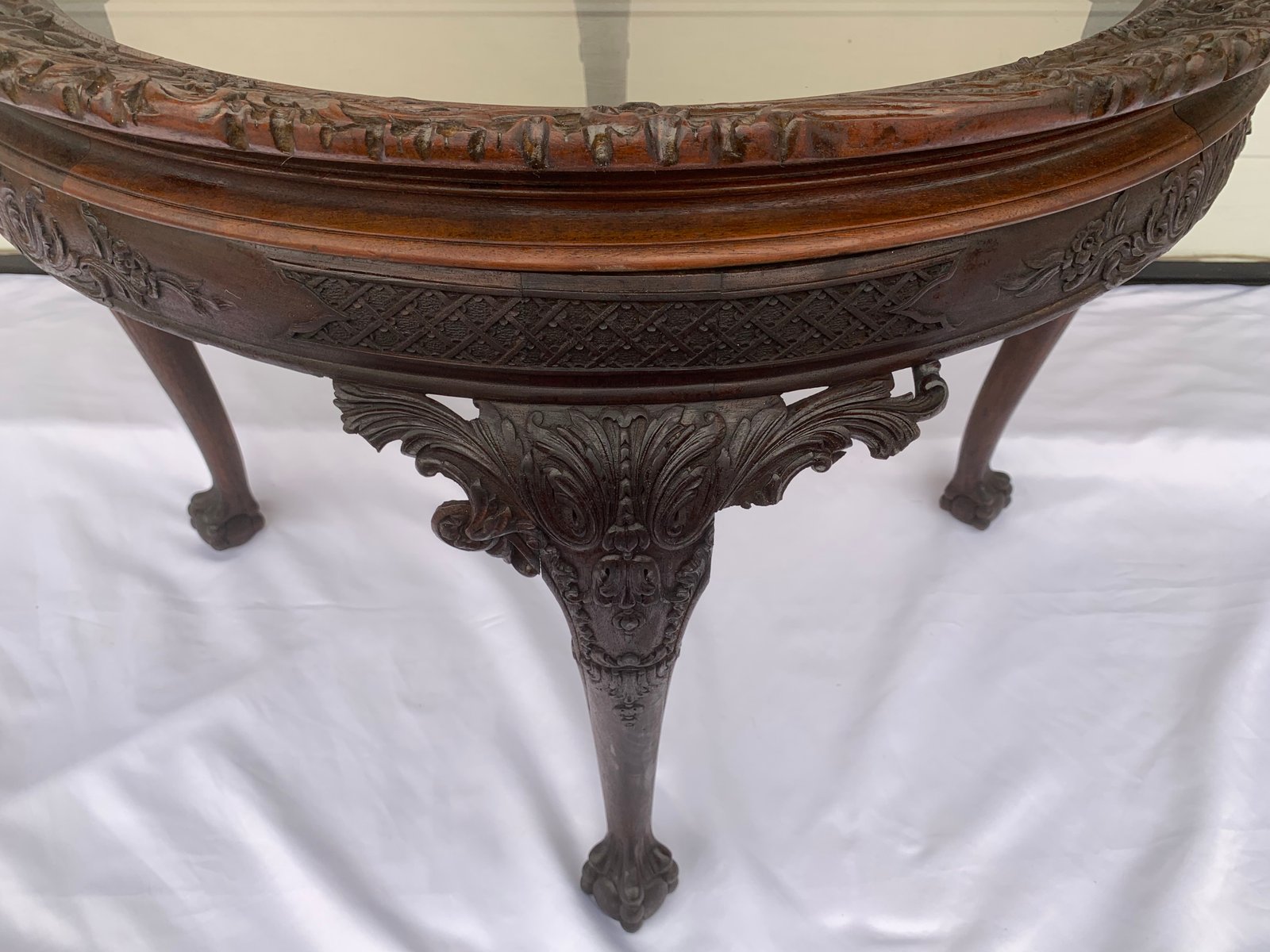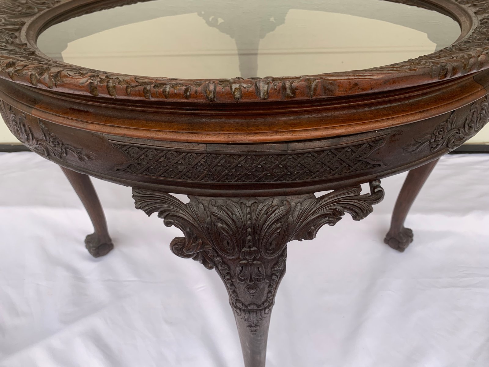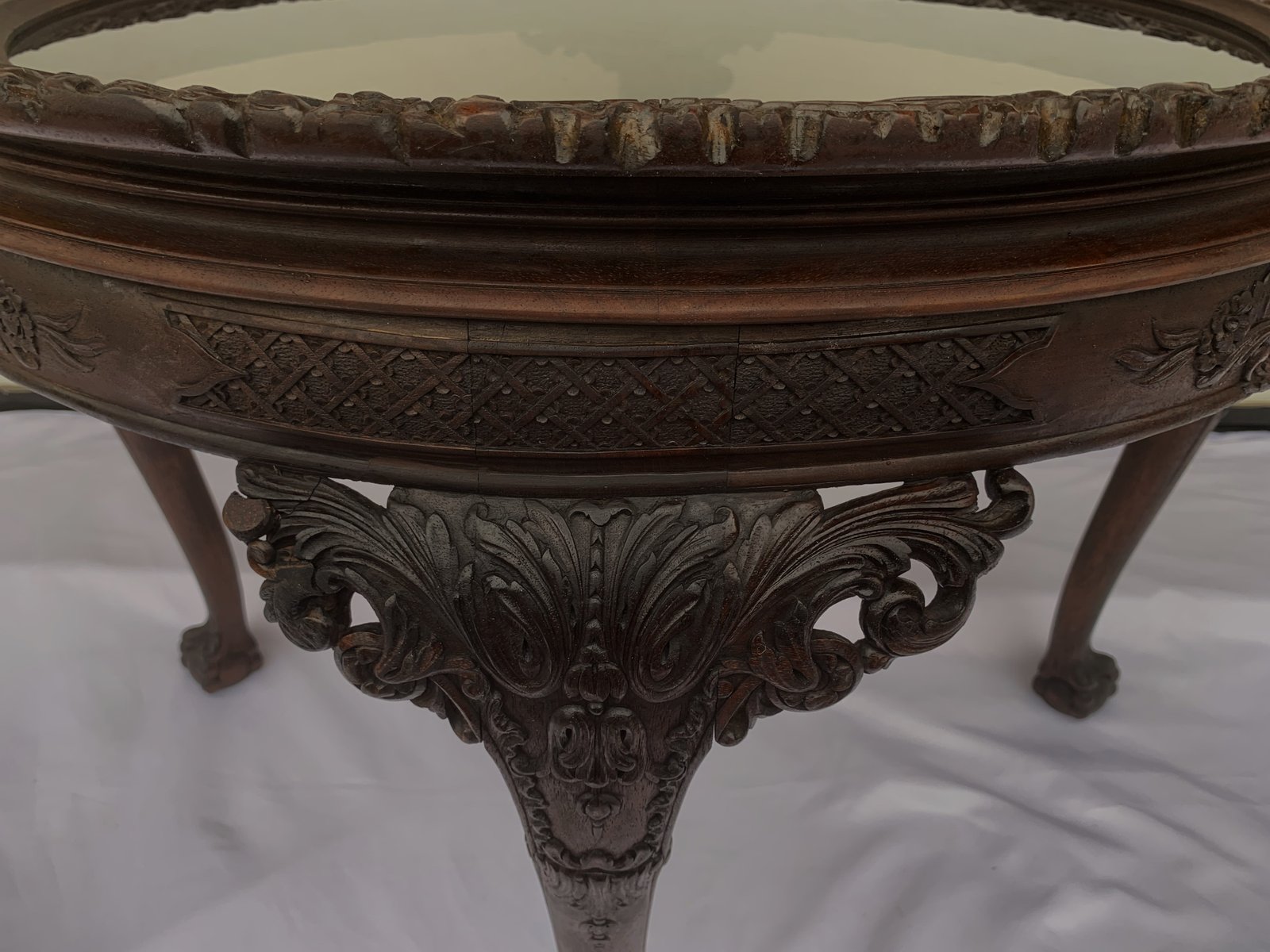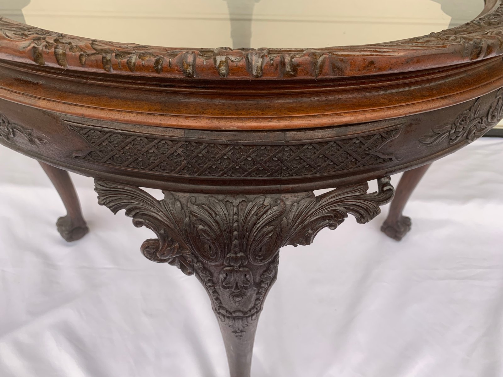 Large English Chippendale Style Walnut Coffee Table with Glass Top, 1940s