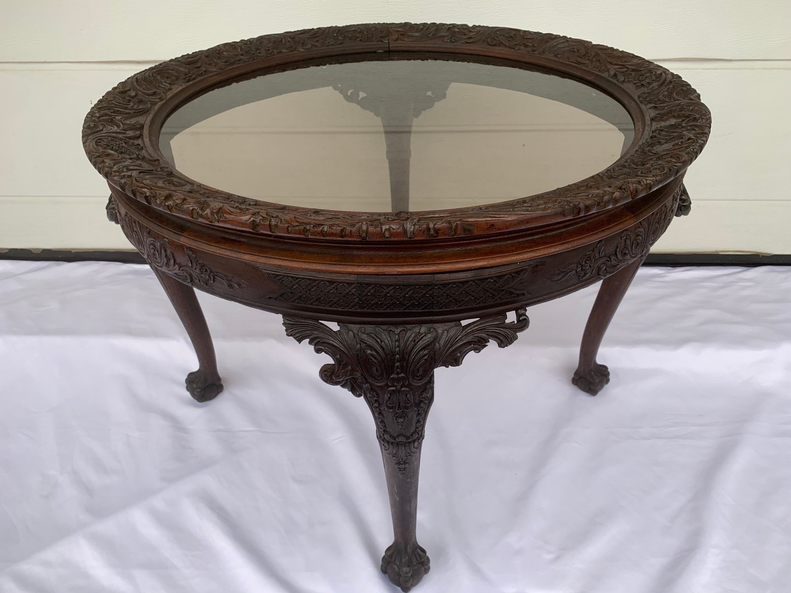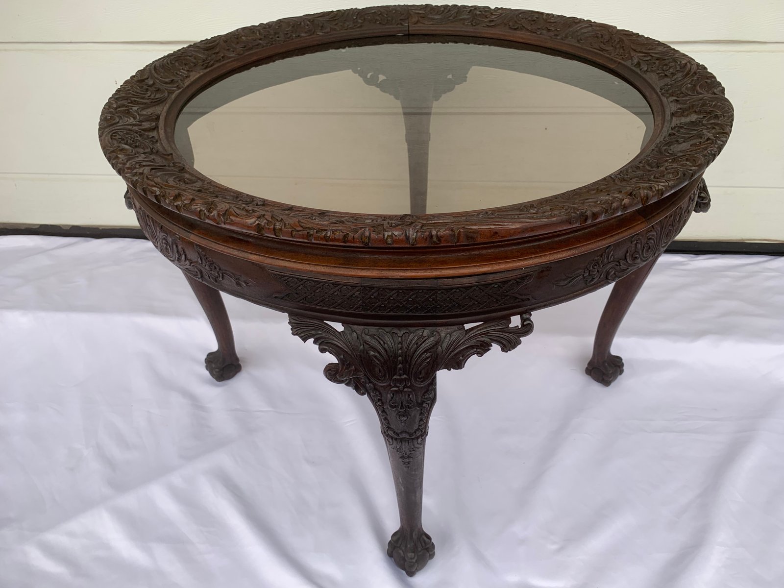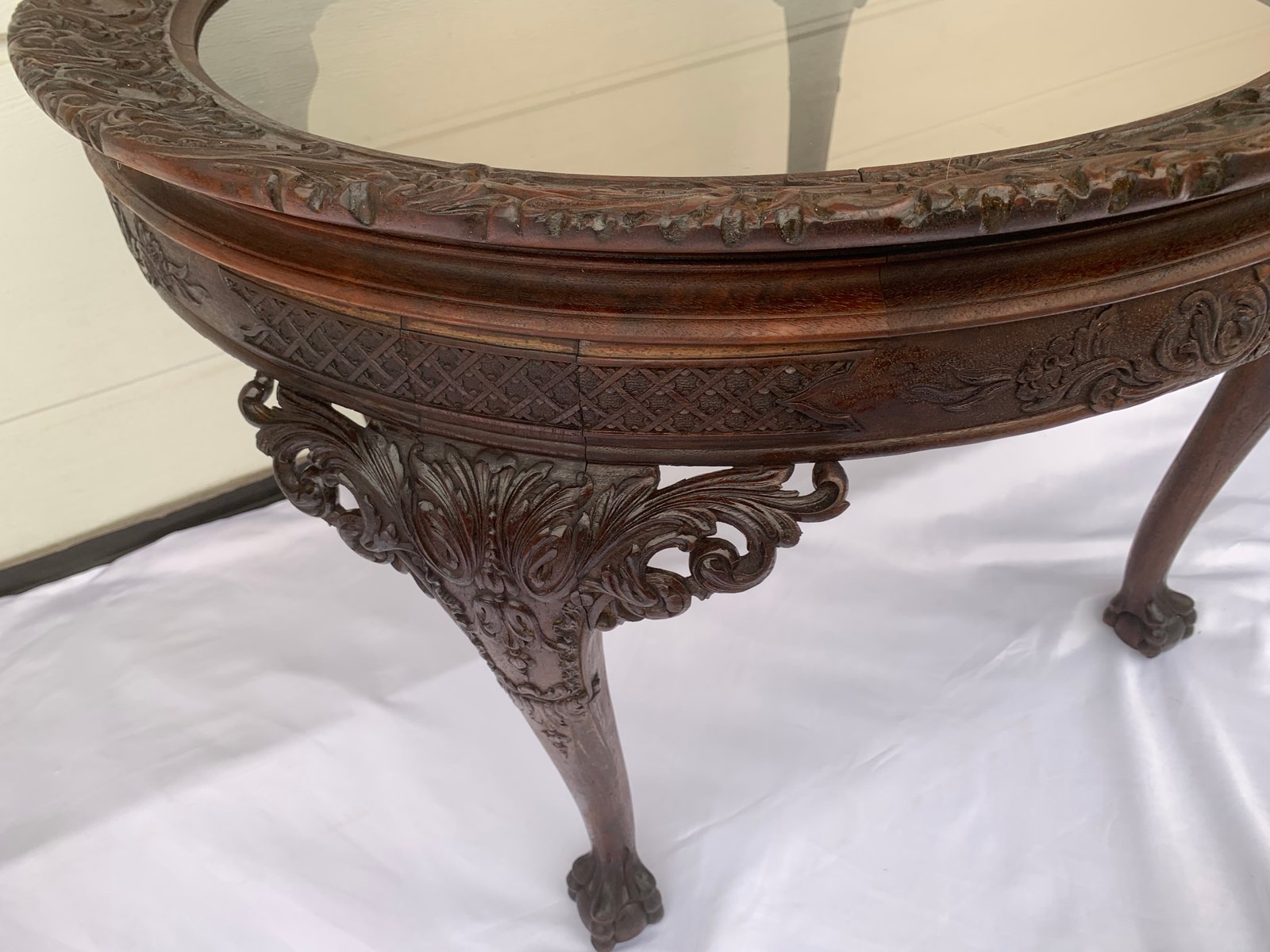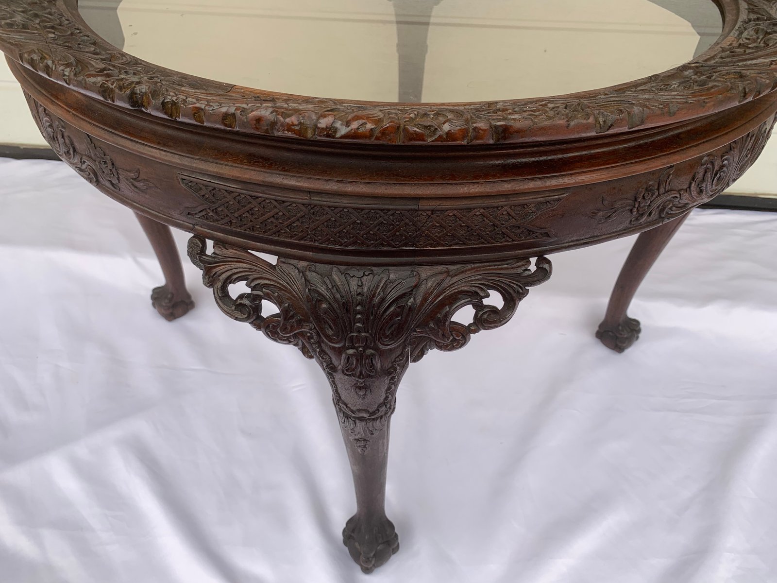 Large English Chippendale Style Walnut Coffee Table with Glass Top, 1940s
