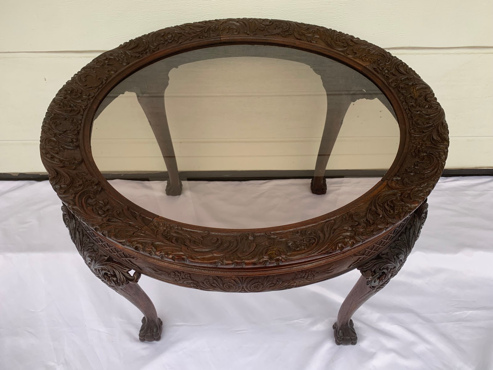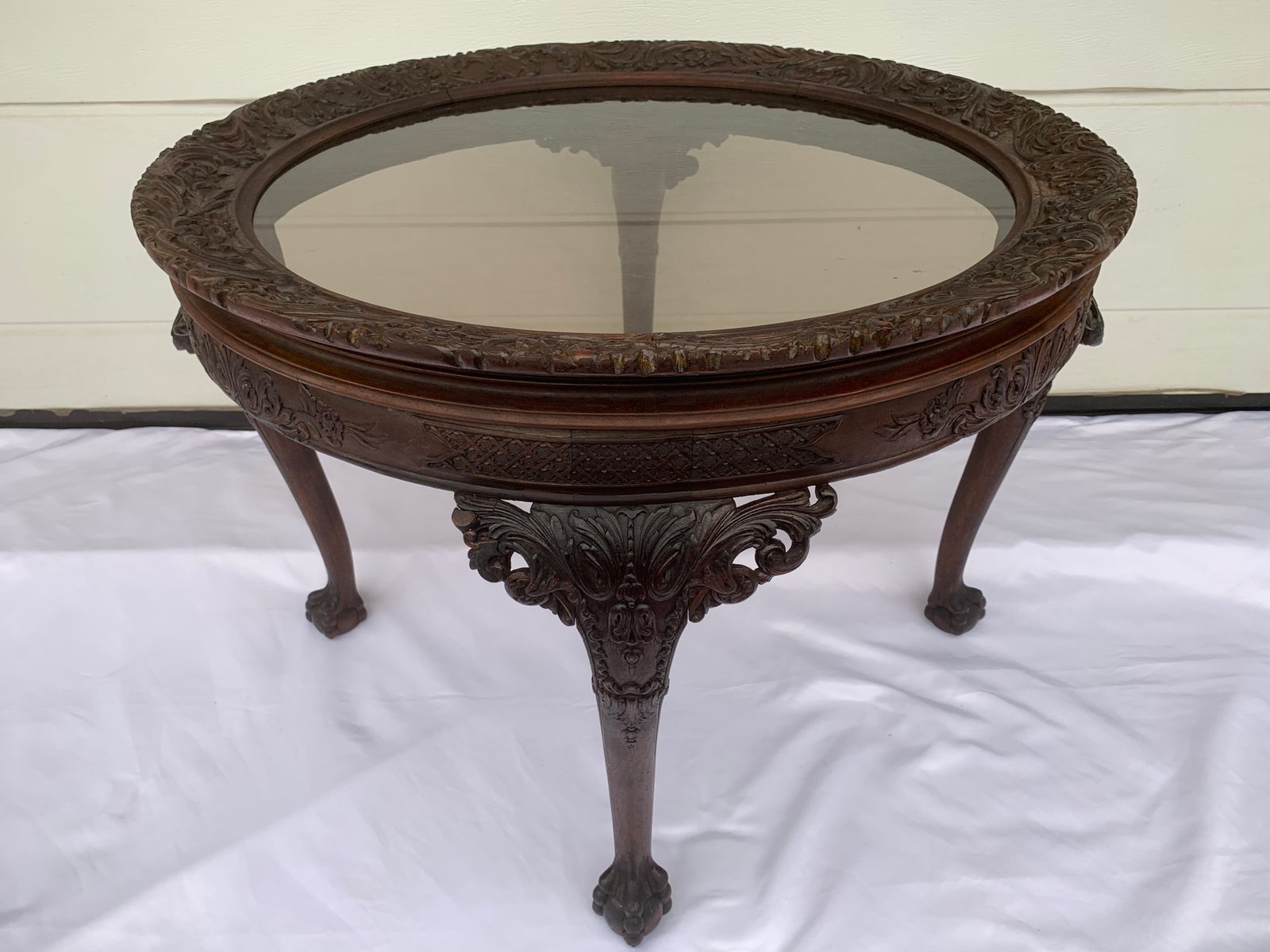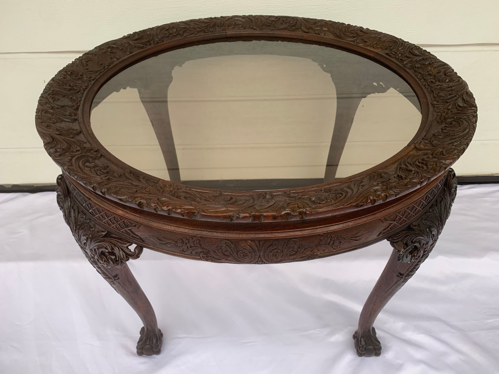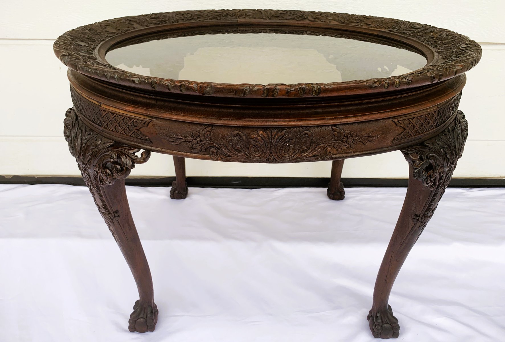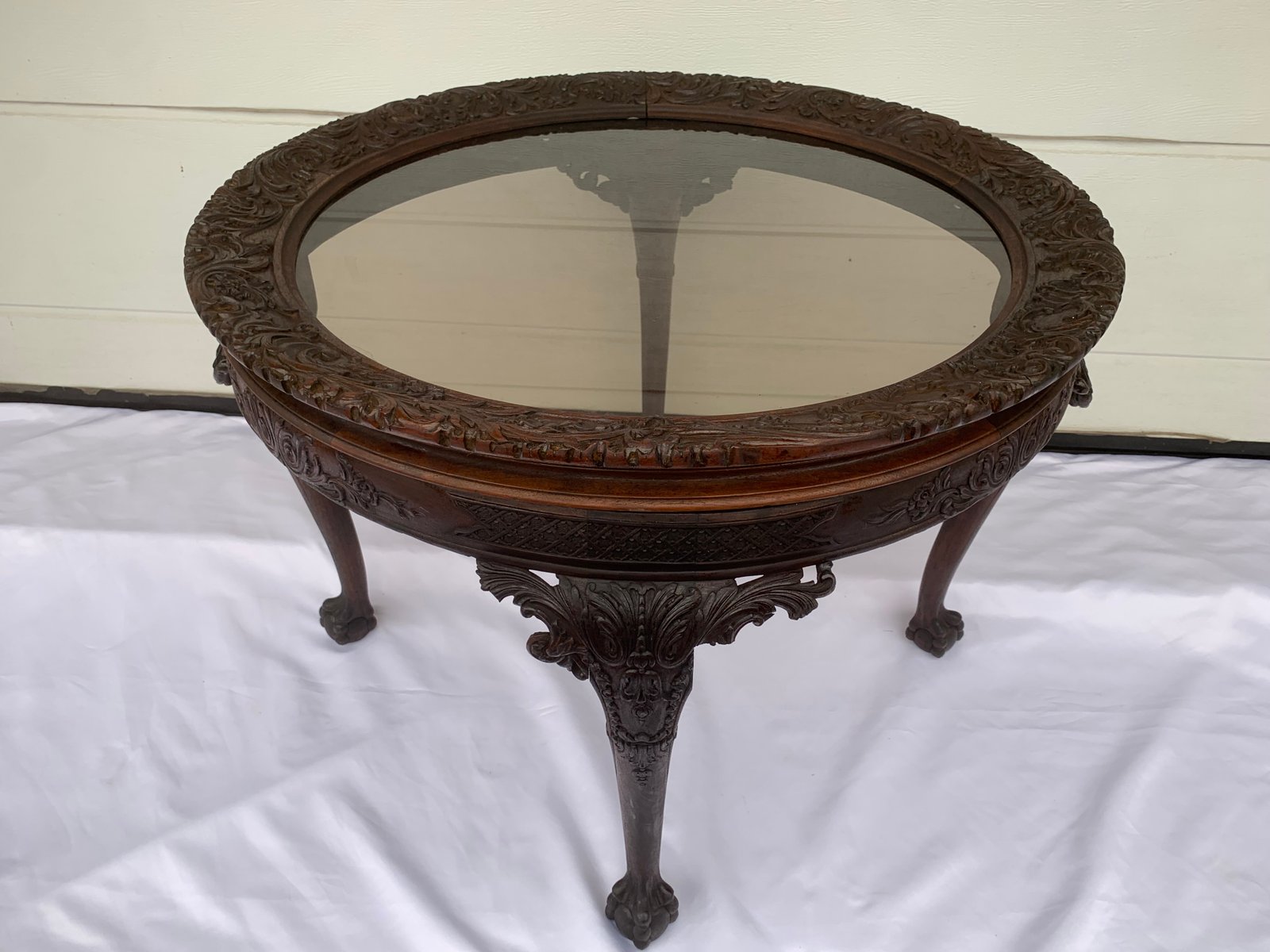 Large English Chippendale Style Walnut Coffee Table with Glass Top, 1940s