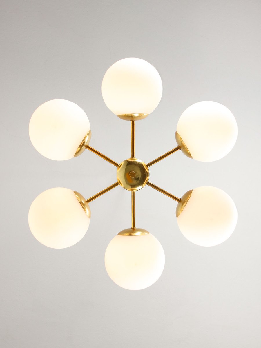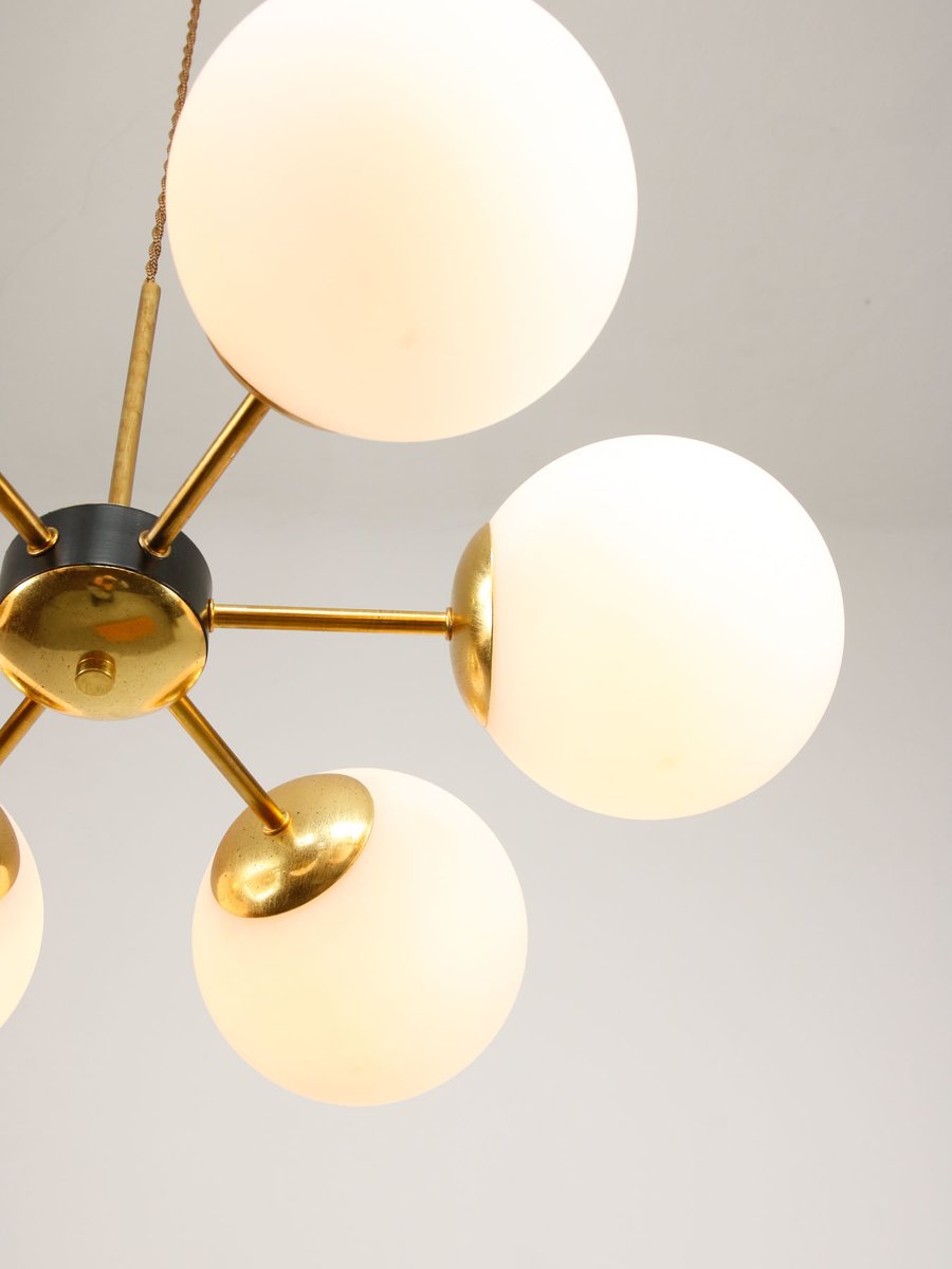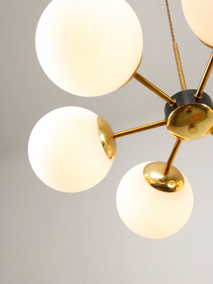 Mid-Century Modern Italian Six-Arm Sputnik Chandelier with Opaline Shades, 1960s