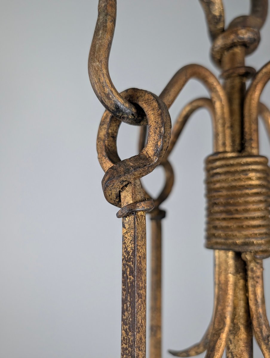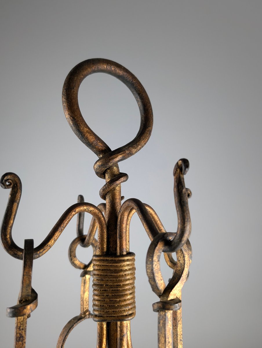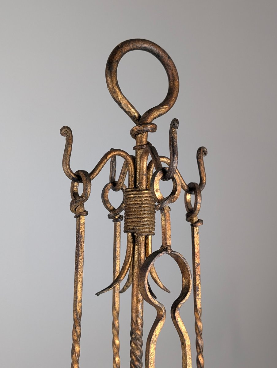 Sculptural Fireplace Tools in Gilded Wrought Iron, 1960s, Set of 5